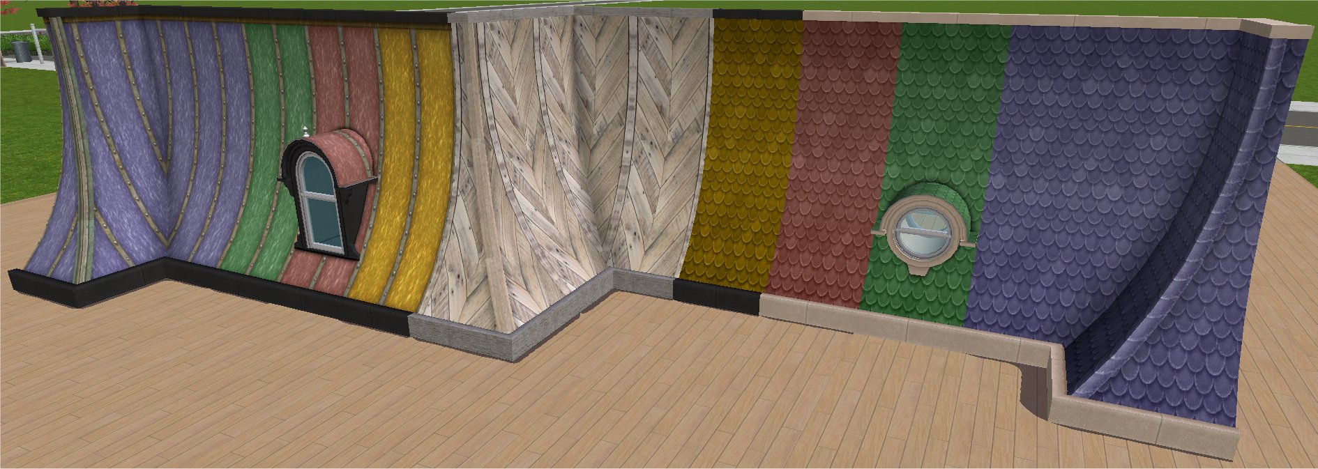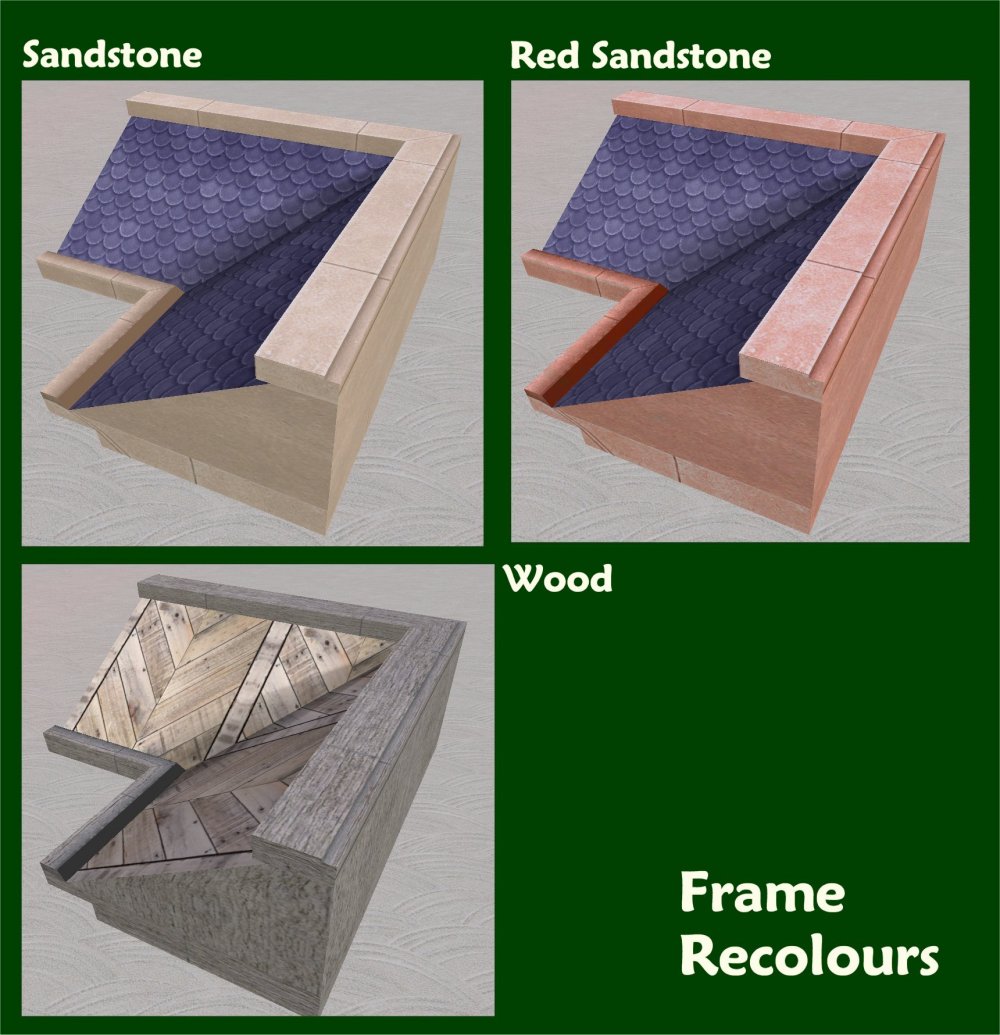 Recolours I also, while I was at it, made some recolours. First I recoloured the tiles and the metal sheeting. I have a tendency to think that I need recolours of things in all the primary colours (well, primary colours plus yellow). Hence I made tile recolours in green, blue, red and yellow and then metal sheet recolours in green, blue and red (there is already a 'striking' yellow recolour so I didn't bother with that. Then I made a couple of 'frame' recolours of sandstone and red sandstone (because I make a lot of sandstone buildings). And then, and I have no rational explanation for this, I just had to make a recolour that was a chevron wood pattern. I have no idea what that is about, I just had to do it and absurdly pleased with myself I am too. I made a wooden frame for that as well because the sandstone and concrete looked funny. Maybe you can make a shed with it. I dunno. I got the original texture of the chevron wood design from Chewton Wood Design