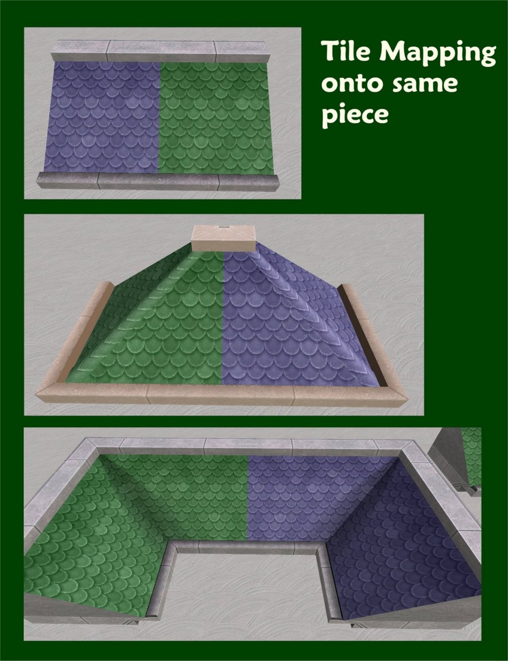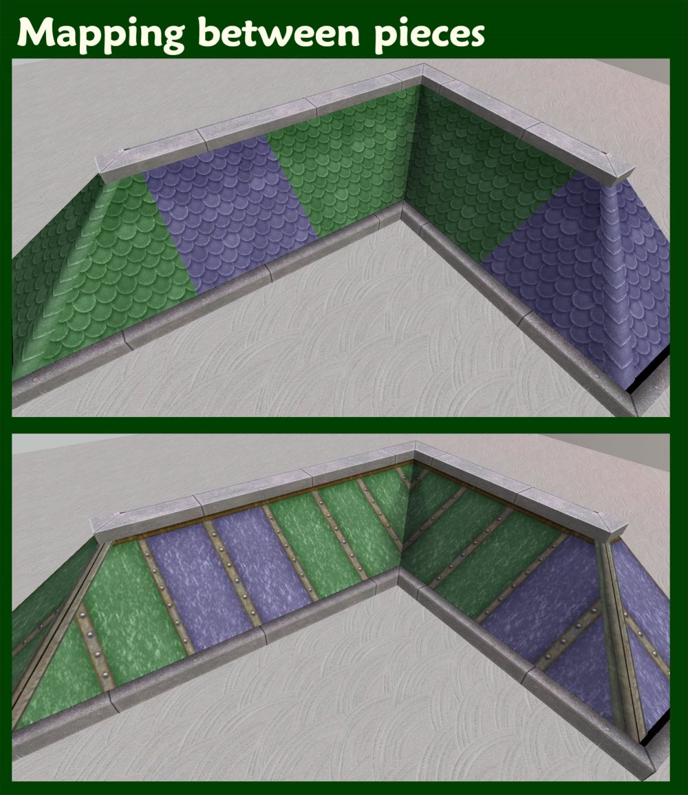 These new meshes are slaves to the original roof pieces and so any recolours you have of those will work with these. They had to be remapped which turned out to be something of a challenge (and I HATE mapping*). There are still some slight issues with the mapping of the textures which you can see if you look closely. In particular, in order to get the tiled recolours to work properly, the plate metal recolours have suffered a little, particularly when you place corner pieces together with others of the same type. With the outer corner, as you can see, the mid-point has no rivets (imagine it's been welded please), while the inner corner has two rows of rivets (a tricky spot, needs extra support). But, as you can see with the tiles, they work nicely together. *This is because the original EAxis texture has a mis-match fault in the tile pattern - you can see it in the picture of the original-size roof pieces with the tile pattern (below)