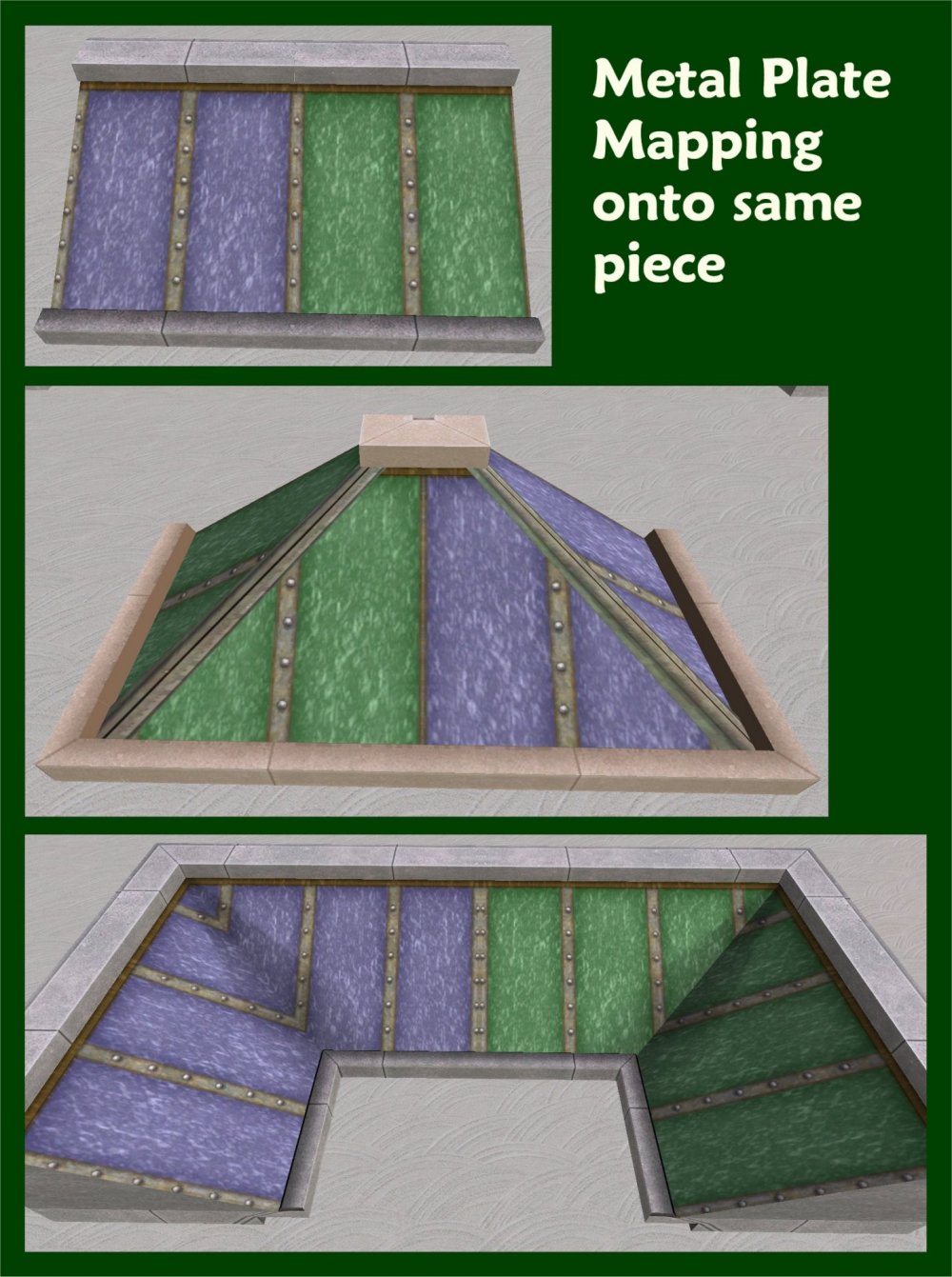 There are four tile recolours (red, green, blue and yellow), four steel plate recolours (red, green, blue and yellow) and a wooden chevron pattern that I just had to make when I fiddled with the Conexion pieces - don’t ask me why. Also frame recolours in sandstone, red sandstone, dark (black I guess) and wooden (for the chevron pattern). The dark frame and the yellow plate are from the Conexion EAxis textures.
