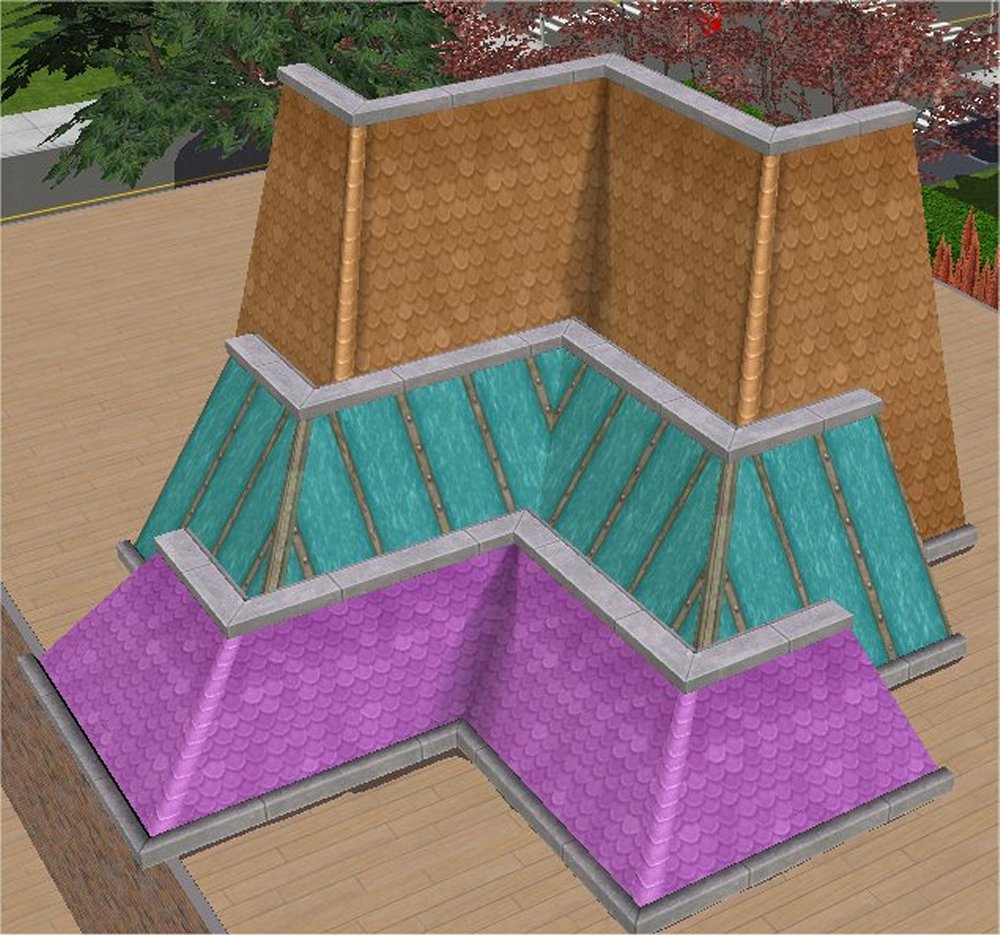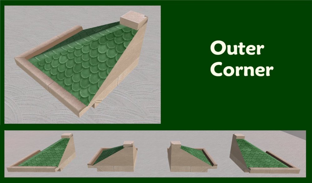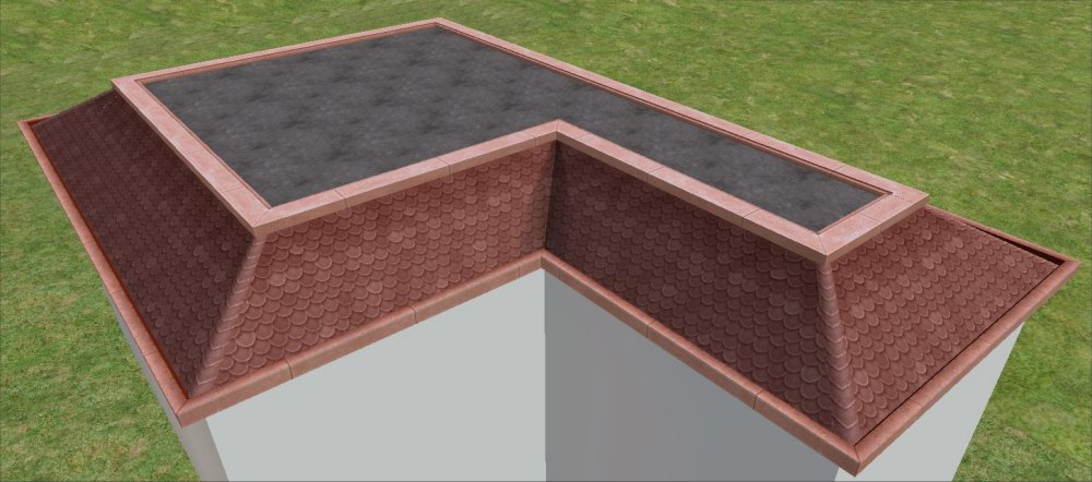 I took the original Maxis Conexion Bohemia Roof Pieces which came with AL and reduced them to a quarter of the height. It isn't just a straight shrink - bit more involved than that - the original 'frame' for the roofing is the same as the original, while the actual slope of the roof is the one that has come down to one quarter of the height. There were originally three meshes for the roofs and there are three new meshes at a quarter height just the same - a straight piece, an outer corner and an inner corner. There are three rar files available: in the first are the three meshes; then there are two types of recolour in the other files (see below), one for the frames and one for the surface of the tiling. Here's all three versions of the roofs together. Mine also fit pretty nicely around a stage which you can use on a flat roof. Catalogue You can find them in Build Mode>Architecture Cost Straight Piece $185 Outer Corner $187 Inner Corner $190