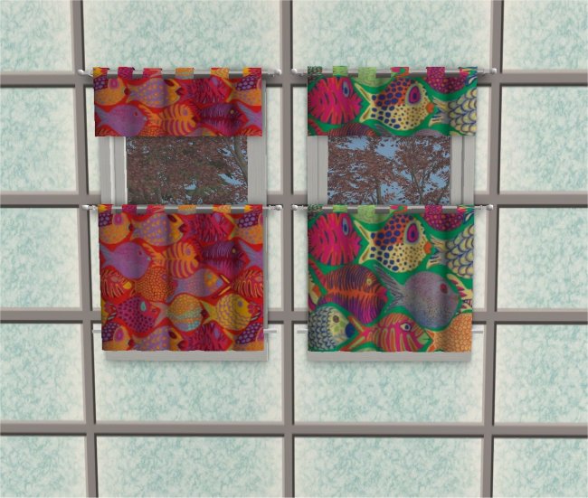Also, as a bonus for this upload, I also include here (so this is not on tumblr) a couple of recolours for the same curtains using textures from the ever reliable Fat Strawberry. These are older recolours but they're bright and cheerful.