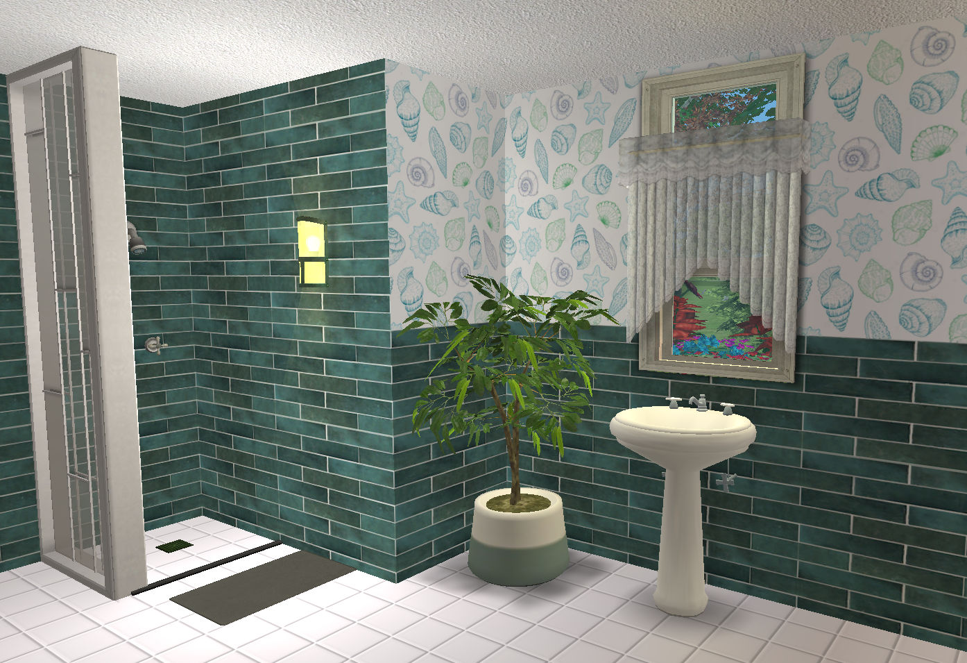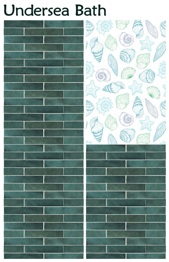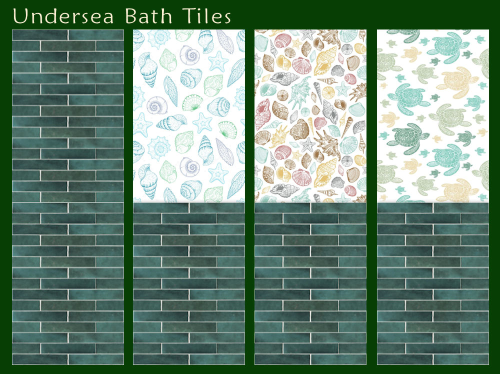 The walls are based on the tile pattern in the first instance - I downloaded the original graphic file but fiddled with the image quite a bit. Then I did an inset painted pattern as the top half. As on other occasions, I created more walls than I was allowed to enter for the contest because I like to fiddle about and try things out. I include those here. The first two were entered into the contest and are called: Full (i.e. the full tiled wall) and Turquoise; the other two are labelled Beach Shells and Turtles. They can be found in Tiling and cost $8. This is the full swatch: