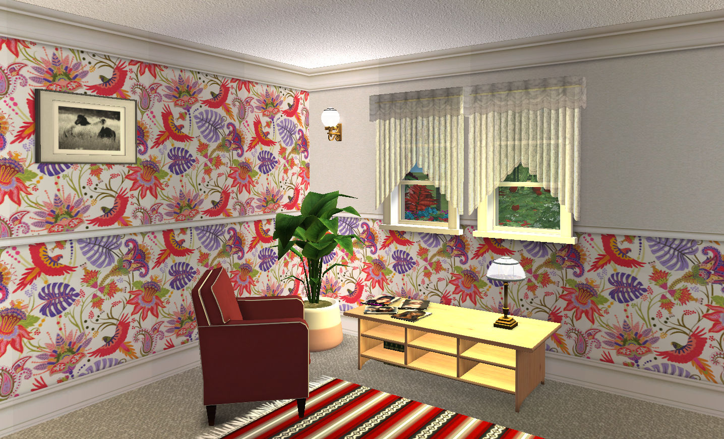 This is my entry for SimPearls' Wallpaper Makes The Room October 2021 - the theme was tropical. So I made these bright and cheerful walls featuring a red parrot (or two). The image came from one of dozens of advertisements that have been fired my way after I did my 'research' for something else earlier this year. It's like Google went, 'oh you're interested in that are you? Well, here's a pile of that sort of thing.' I know it does that but I have collected an enormous number of bright floral images. Maybe I'll use them...