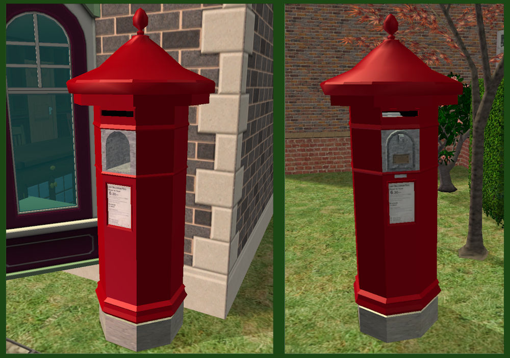 I really like Maylin's decorative street furniture but, in the original form, you couldn't see it from other lots or neighbourhood view - this version makes both the phone box and post box visible from space, or at least those two aforementioned locations.