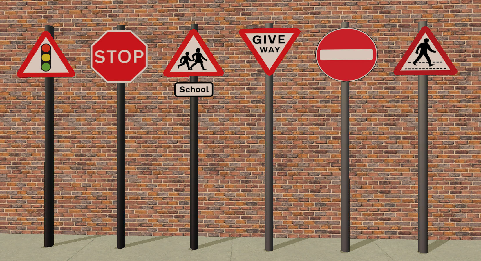So my prompt was My Way or the Highway – a tricky one and I finally gave up on trying an imaginative metaphorical interpretation and went for a literal one instead. I decided to add something to my attempt to ‘British-ise my game’, in this case: British Road Signs. I have only made six here but made a new CC mesh for the sign itself. It’s alpha-channel controlled head means you can make different shaped signs for it. So we have British road signs for: Give Way (Yield, I think, for American drivers. This is probably the most common sign on British roads), Stop, Crossing, School, Traffic Lights and No Entry. There are more to come. They can be found in Misc>Misc and cost $70. 286 polys. They are visible from space (or the neighbourhood and other lots).