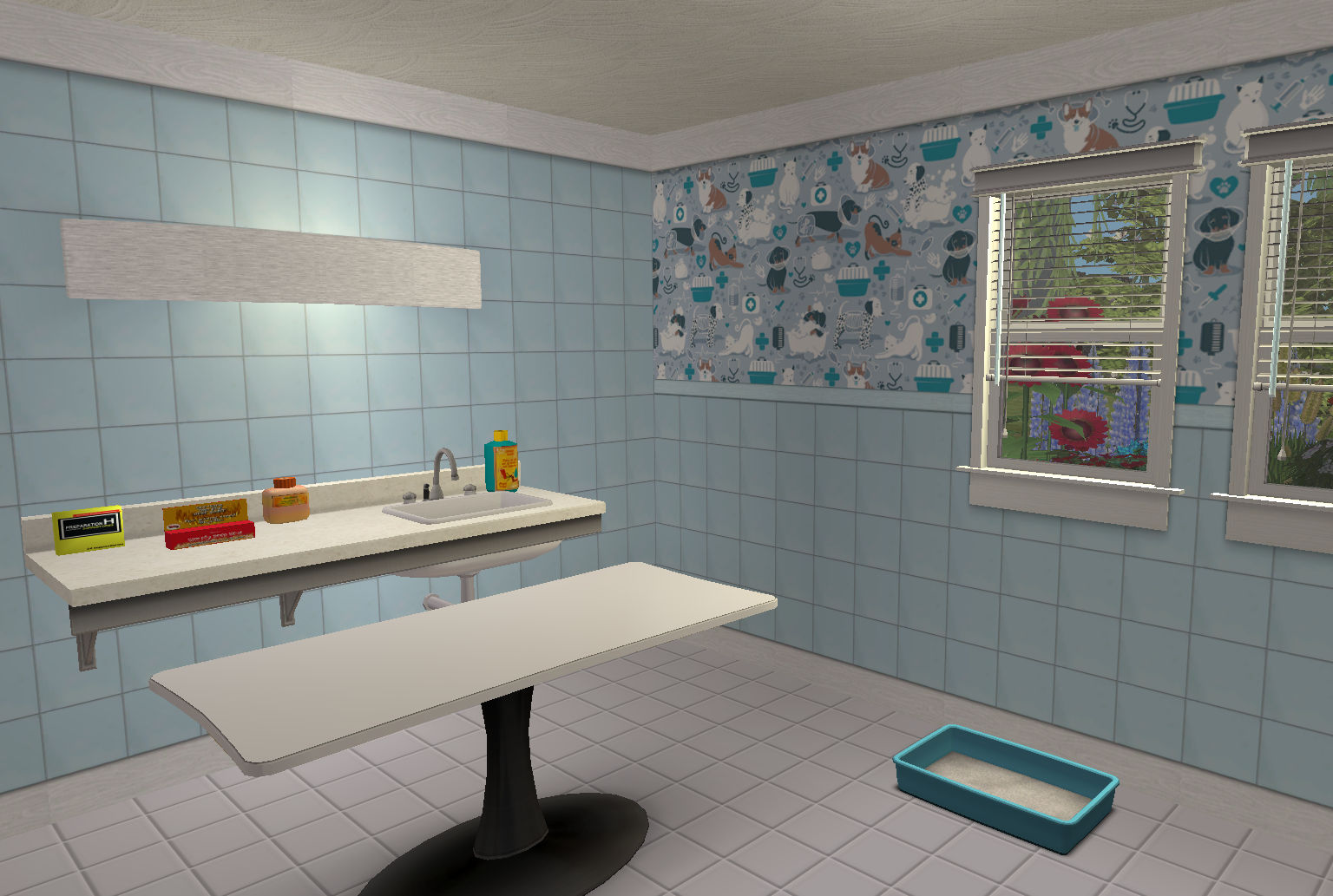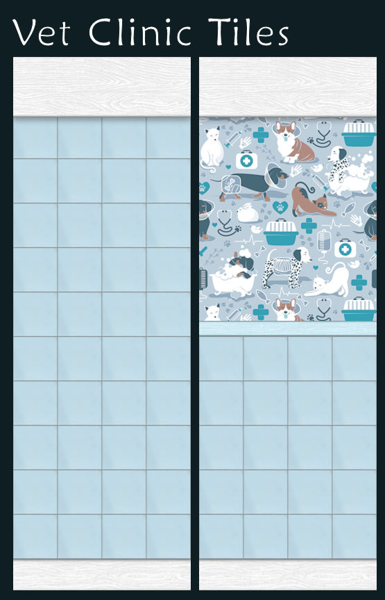 This is my entry for Sim Pearls Wallpaper Makes the Room for June 2022. The prompt was to create two walls for a Vets Clinic - I made some nice blue tiles as a full wall and a half tiled wall with a pets hospital-themed paper at the top. Plain skirting and crown for easy cleaning because vets need to be hygienic. There's also an extra wall in there not entered in the contest with a plain plaster top to complete the set (not pictured). As is usual with my walls, the crown is set to a height to show properly under a ceiling - this makes the crown appear a bit high when viewed from above.