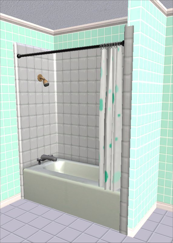 Well, I was fairly pleased with the wall tiles (and toning floors) but it is true that it is still difficult to build a full on pink bathroom since there is little furniture and deco available that will match or blend with the tile colours. In fact, I was asked (by Magicslippers) about a quick and dirty recolour of the Aqua Plus Shower I made for the screenshot on the thread. Well, I’m not much of a recolourer but I can do texture overlaying quite well now so I thought I’d have a go and supply a set of matching shower curtains to get you started.