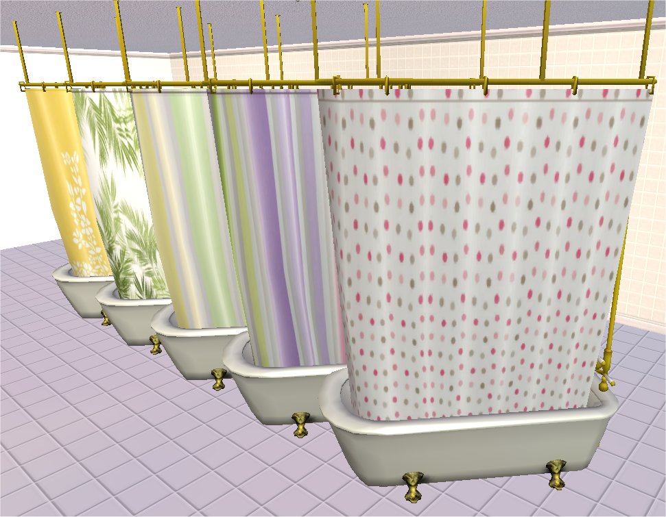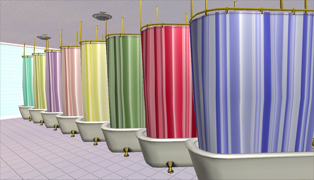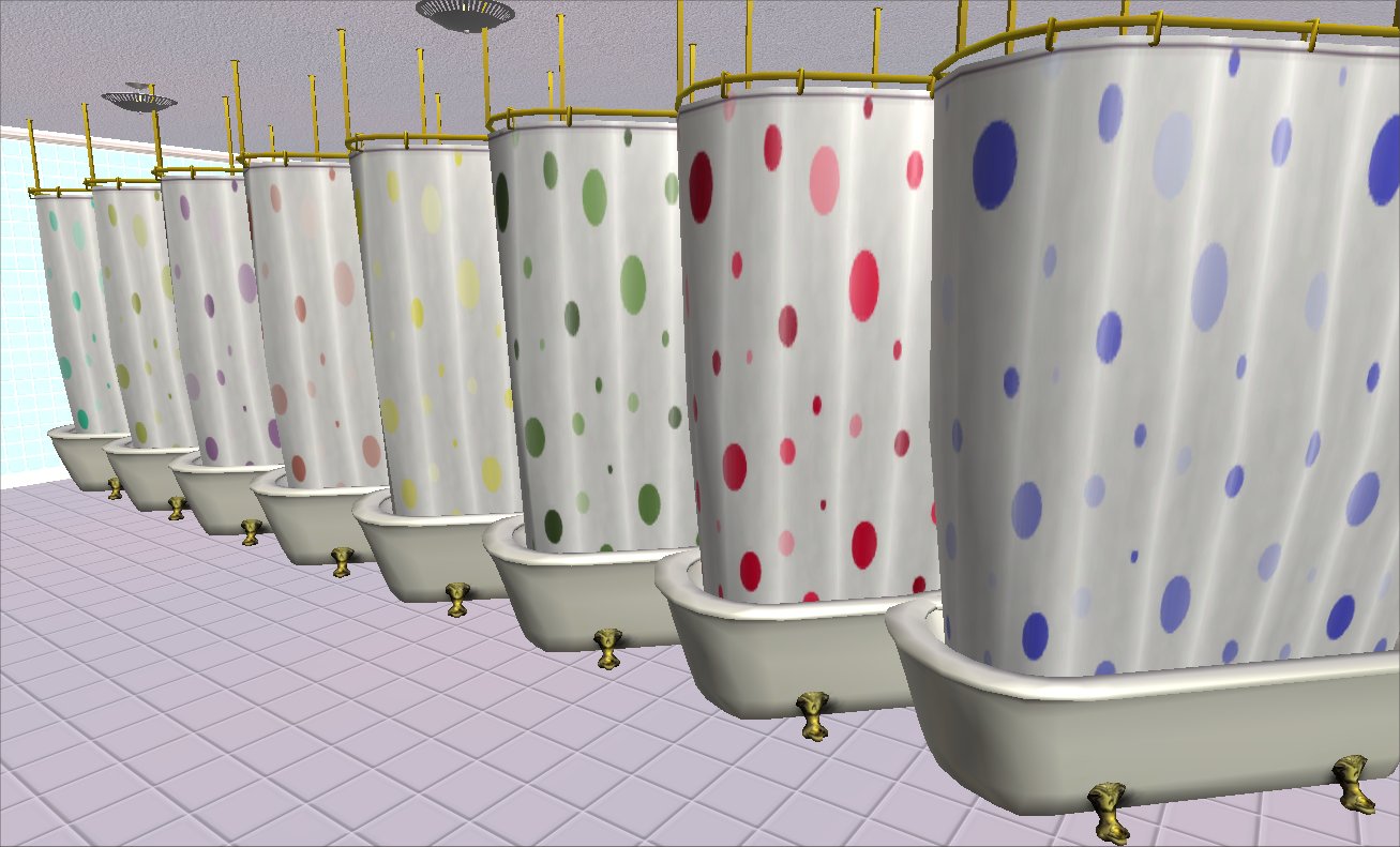 So here they are. I made shower curtains for all three of the basic EAxis showers: the Colonial Bathtub (expensive); the Aqua Plus Shower-Tub (medium) and the Clean Water Shower (cheap). I started with the Colonial Bathtub since that has (by far) the easiest texture to work with. I made a set of striped curtains and a set of spotty curtains and some random textures I just liked (typical me).