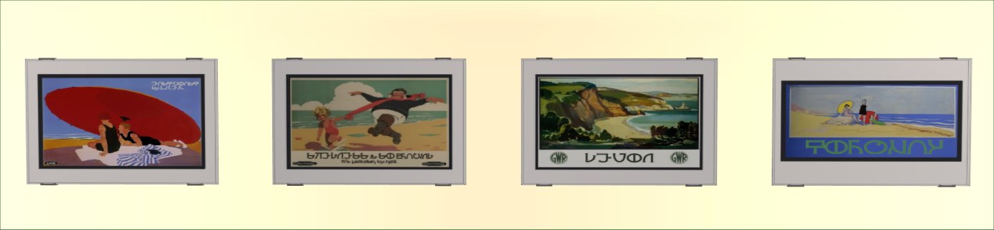 However, there were also several landscape format posters which I also wanted to include so I made a remesh of the Pineapple poster into landscape format for those. This is a new mesh. I fiddled around a bit with the images, setting them in a frame and mount and converting the text to Simlish. The Skegness poster is the base and the others are recolours of that mesh.