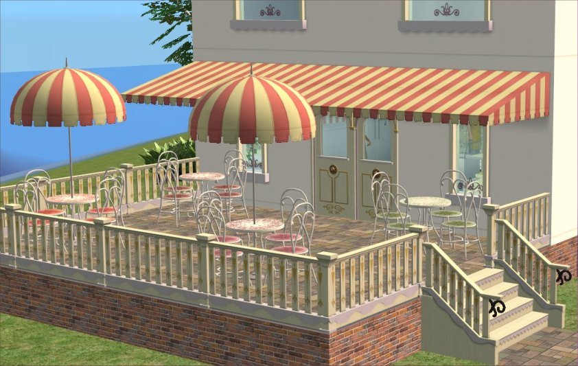 I have created a set of four awning recolours matching the wallpapers for my Arcady Ice Cream Parlour. These are recolours of Windkeeper's Awning Superset which can be found here. You must have the original meshes from Windkeeper to use these recolours. It's TSR unfortunately.
