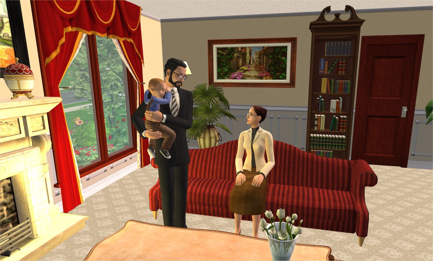 Most stuff in the pictures is Maxis. Wall paints are some of mine; white curtains are by Cassandre at Black Pearl Sims and the mesh can be downloaded here along with some nice recolours: here; that fabulous painting is a recolour of Bella Squared by devagirl2 here.