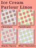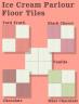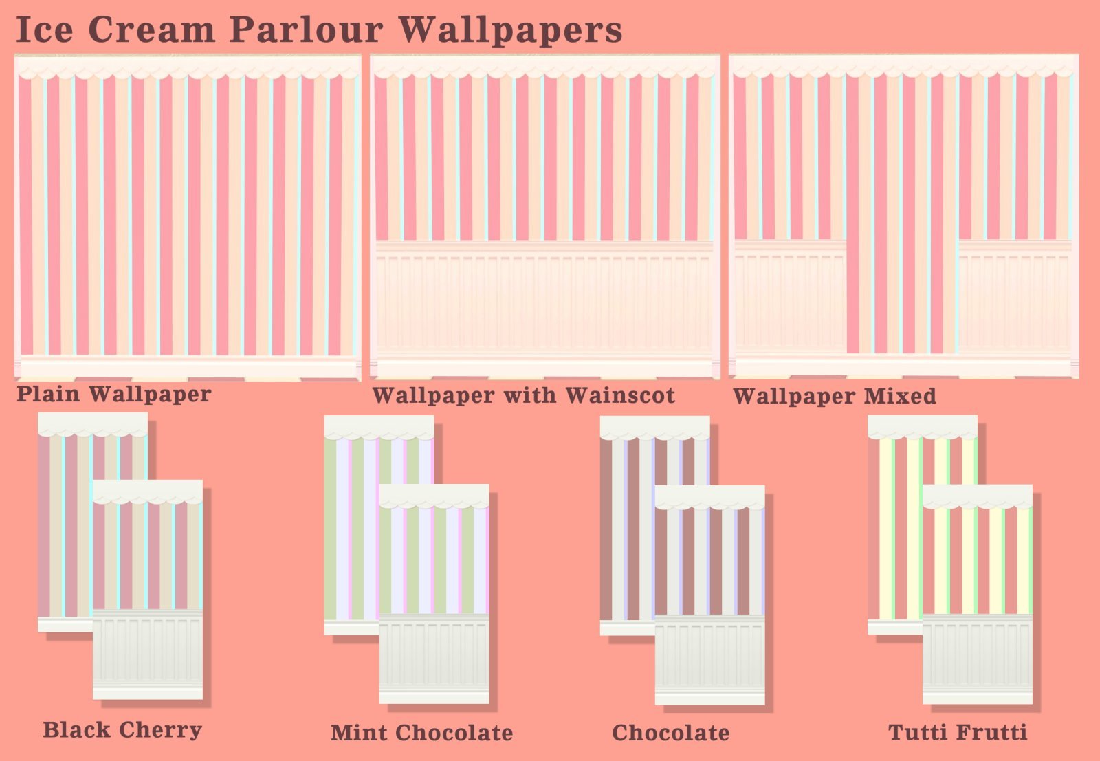 This wallpaper and floor set is to add to my Arcady Ice Cream Parlour set of ice creams in order to be able to build an ice cream parlour in a distinctive set of matching colours and designs. The colours and design are based on the design of four of the ice cream buckets from that set. The other parts of this set can be found here: