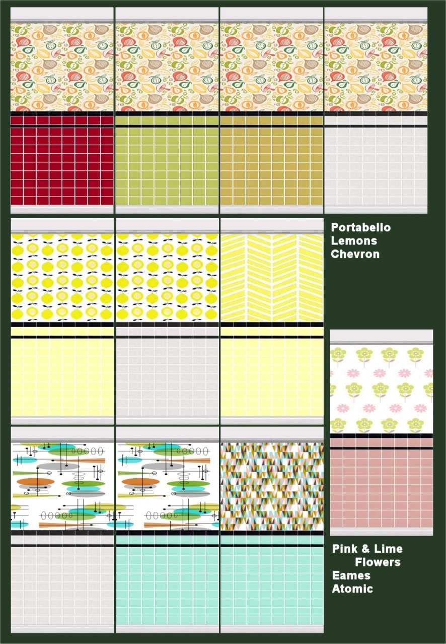 Grammapat did a WCIF a while back asking about CC to make a pink bathroom 1950s style and I went mad and made a whole set of tiles for kitchens and bathrooms. But something about the websites I was looking at for ideas got to me and I went even madder still. As I travelled across the internet looking for inspiration, found some lovely textures that I thought would work nicely as retro style wallpapers with a modern take.