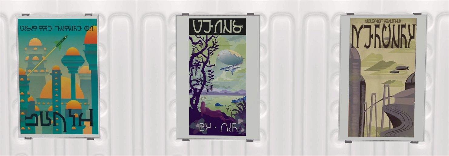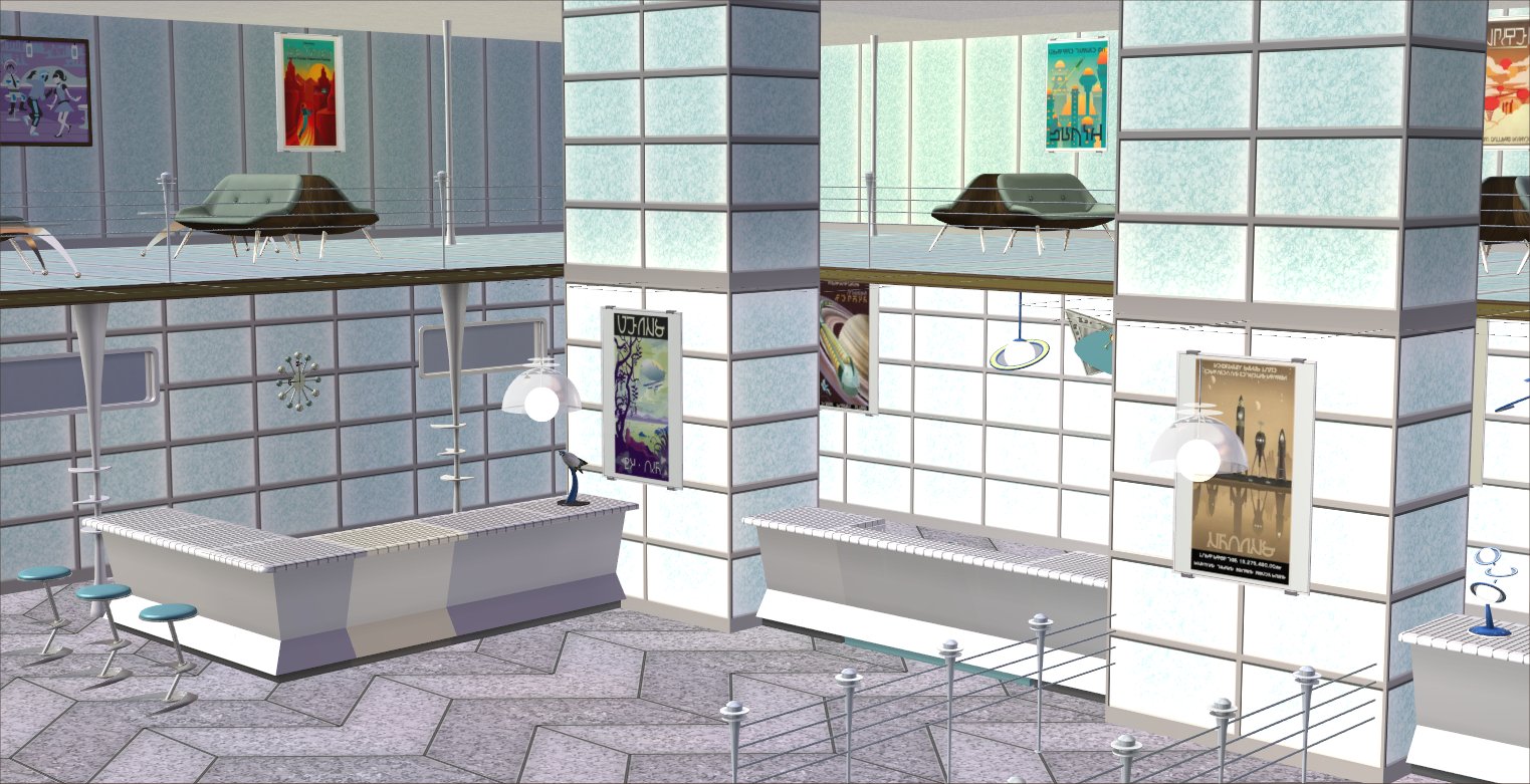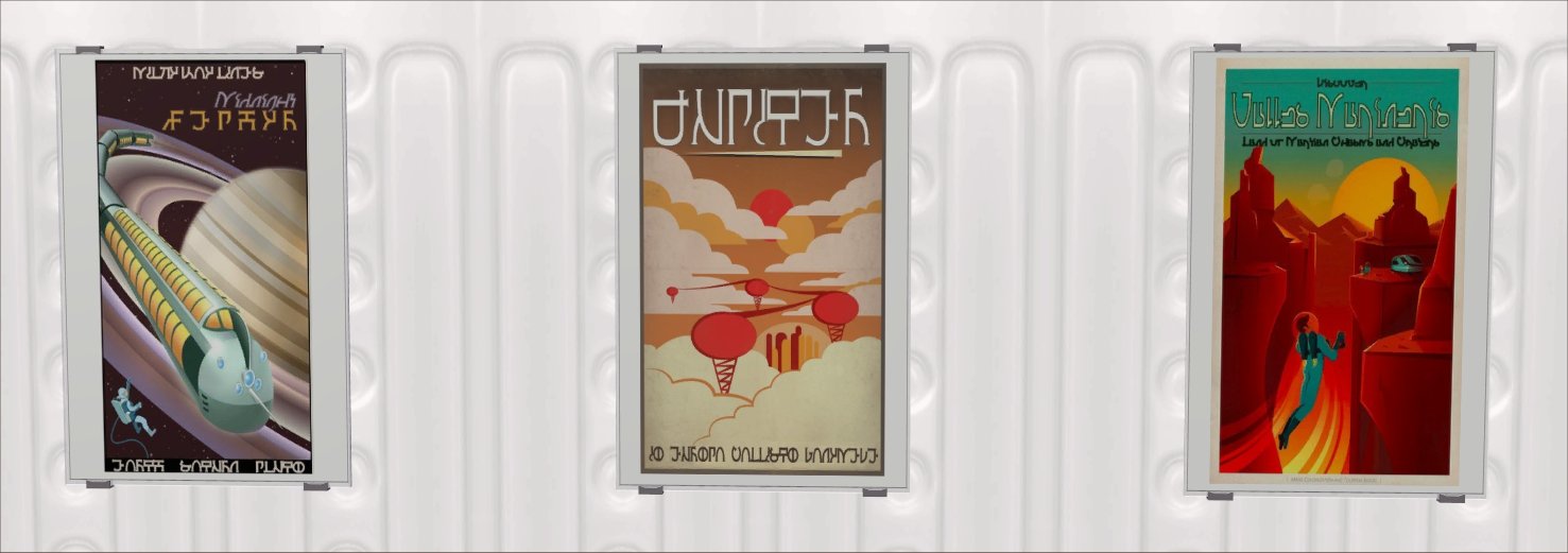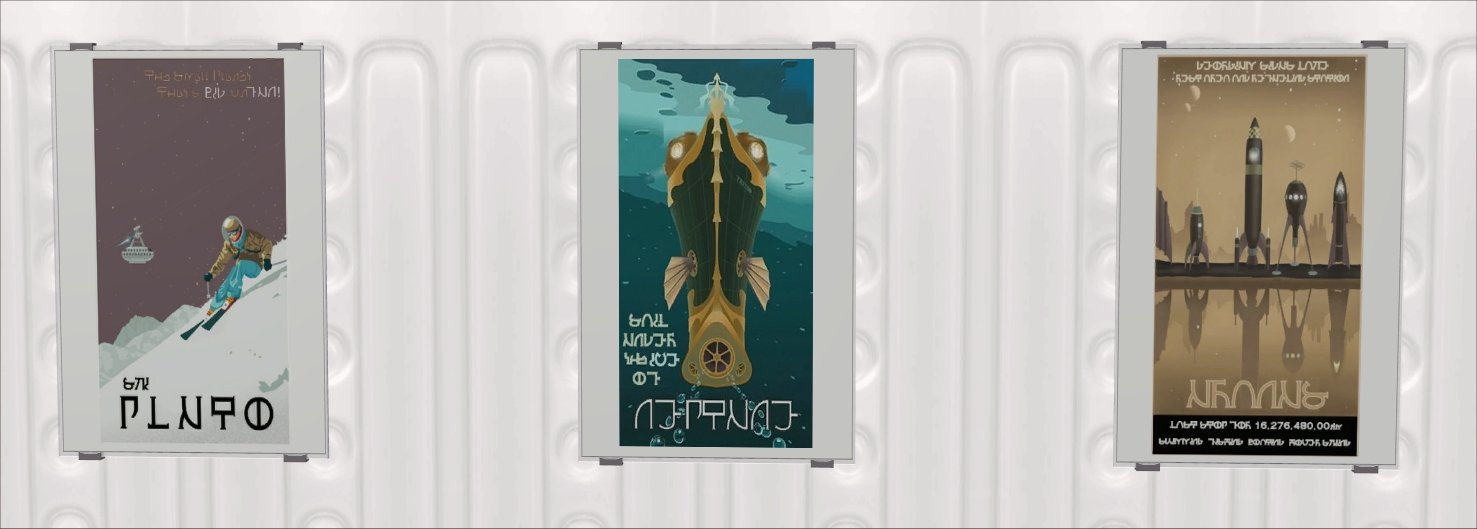 There is one poster for each planet in the solar system and so they form a complete set. Pluto is included since it was still a planet in the 1950s and also because the notion of skiing on Pluto somehow amused me greatly. They are all recolours of the Nightlife Pineapple poster and have all been Simlished. You will, therefore, need NL for these to show up in your game.