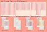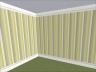 The eight walls come in two varieties, four of each: one is a stripe with a plain skirting or kickboard and a scalloped crown; the other is the same but with added wainscotting. The sets are designed to be seamless when used together. They are catalogued as wallpapers and cost $6.