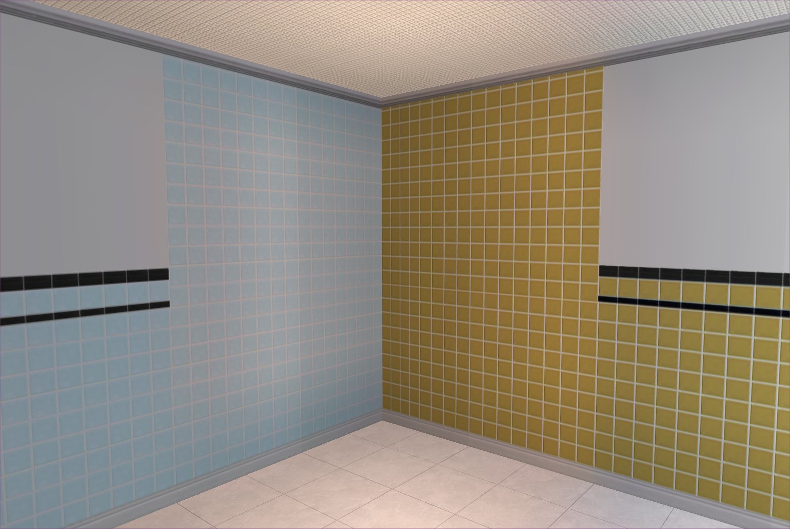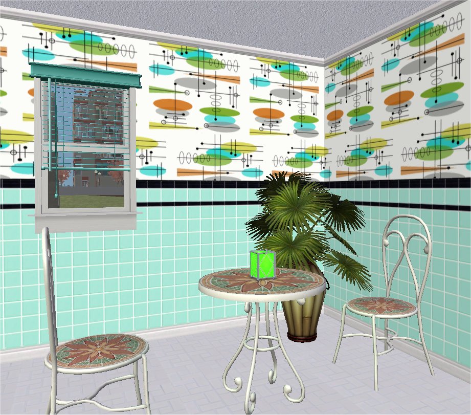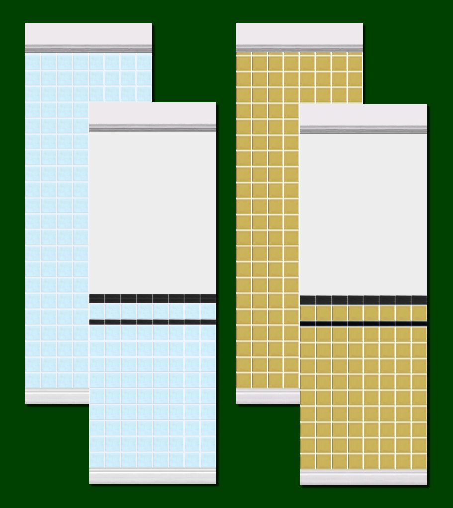 The reason they weren't in the original upload is that when I originally uploaded this set, I eventually decided on a colour scheme of (what I thought were) typical 50s colours - that is Candy Apple Red, Chartreuse, Lemon, Salmon Pink and Turquoise.  These blue and mushroom files were made at the same time and used the same texture resources but I excluded them from the final release because of the colour scheme.  Actually, a variant of the mushroom tiles was included in the extra walls in the above post.  Well, here are the matching plain tiles for that plus the extra blue ones which I've used quite a bit myself.  They make a good bathroom tile.